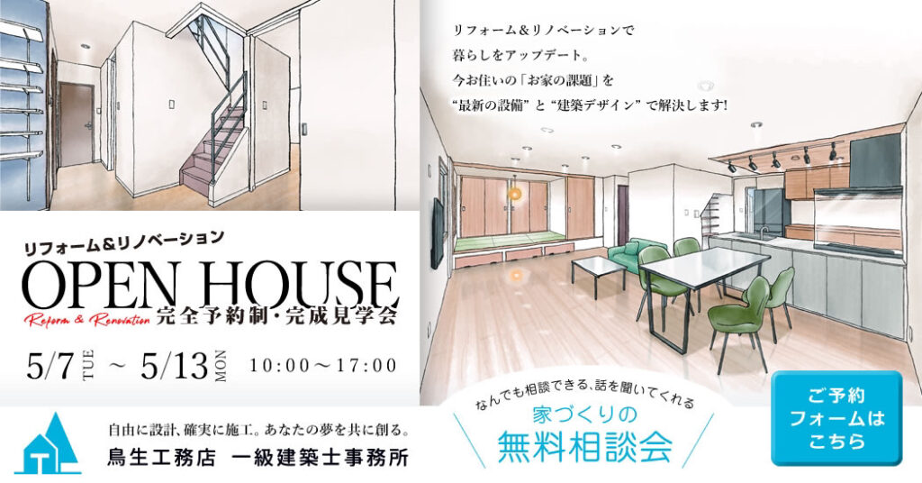 2024-05-16 / 最終更新日時 : 2024-05-16 toryu お知らせ リフォーム住宅見学会のお知らせ(終了しました) 今治市「Reform & Renovation」 5/7(火)〜13(月) 10:00〜17:00 完全予約制 お客様のご好意により、「リフォーム住宅見学会」(完全予約制)が実現いたしました。 ご予約フォームはこちら 当社の施工例をじっくりとご覧いただける絶好の機会です、上記メールフォームからご予約ください。スタッフ一同、皆様のお越しをお待ちしております。 5月7日〜13日開催のリフォーム住宅見学会は、無事終了いたしました。ご来場いただきました皆様、誠にありがとうございました。 FacebookXBlueskyHatenaCopy